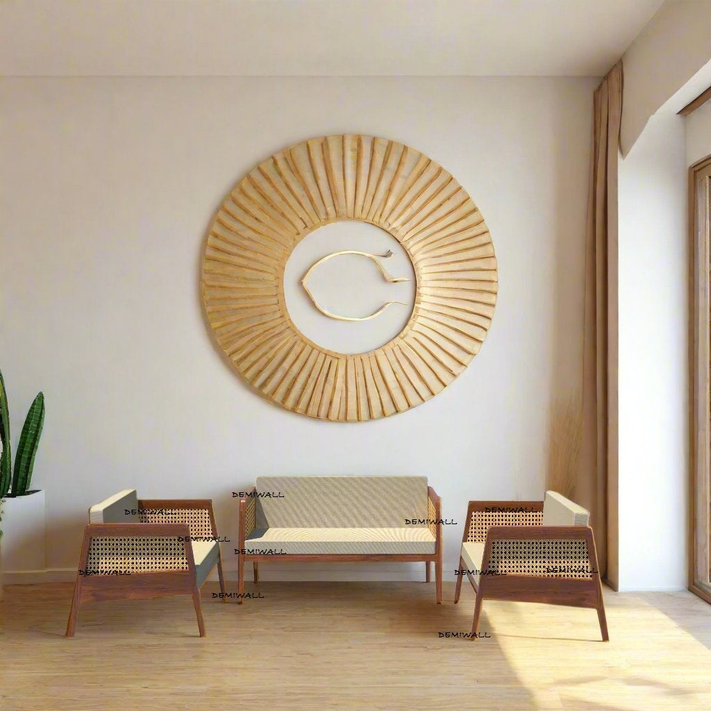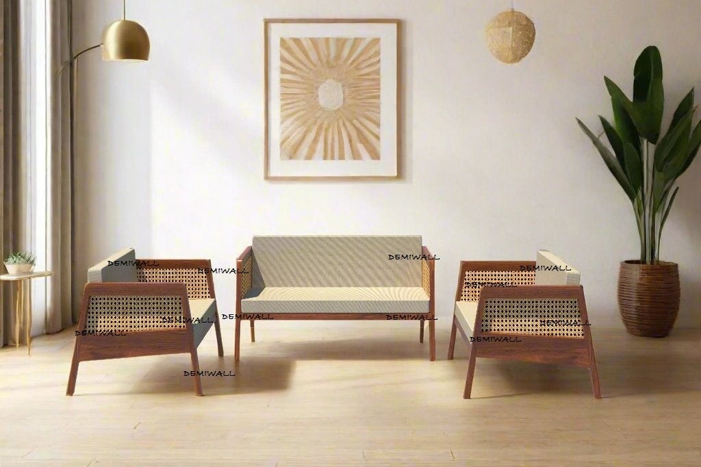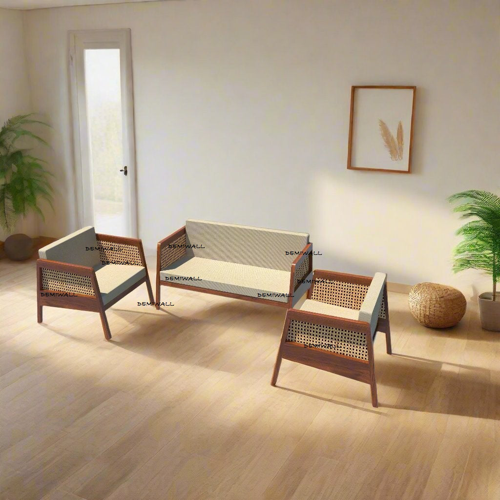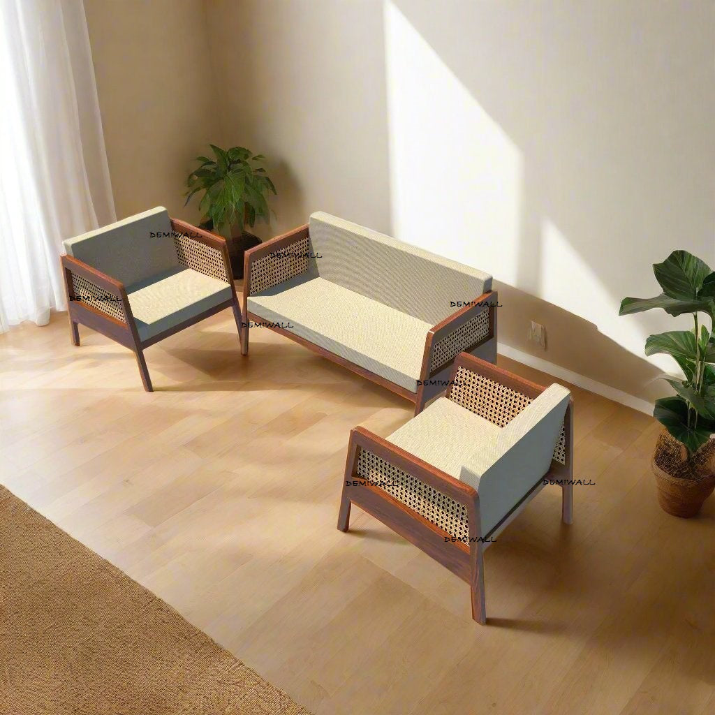 DEMIWALL Solid Wood Roman Sofa Set 5-Person Rattan Caning Sofa | Teak finish