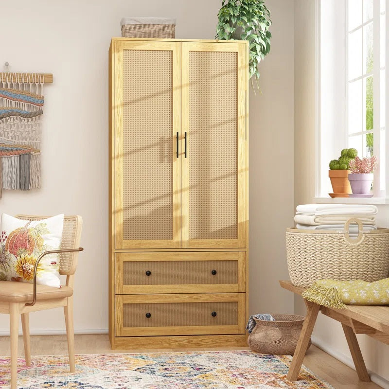 Solid Mango Wood Rattan Cane Two Door With 2 Drawer Wardrobe In Natural Finish