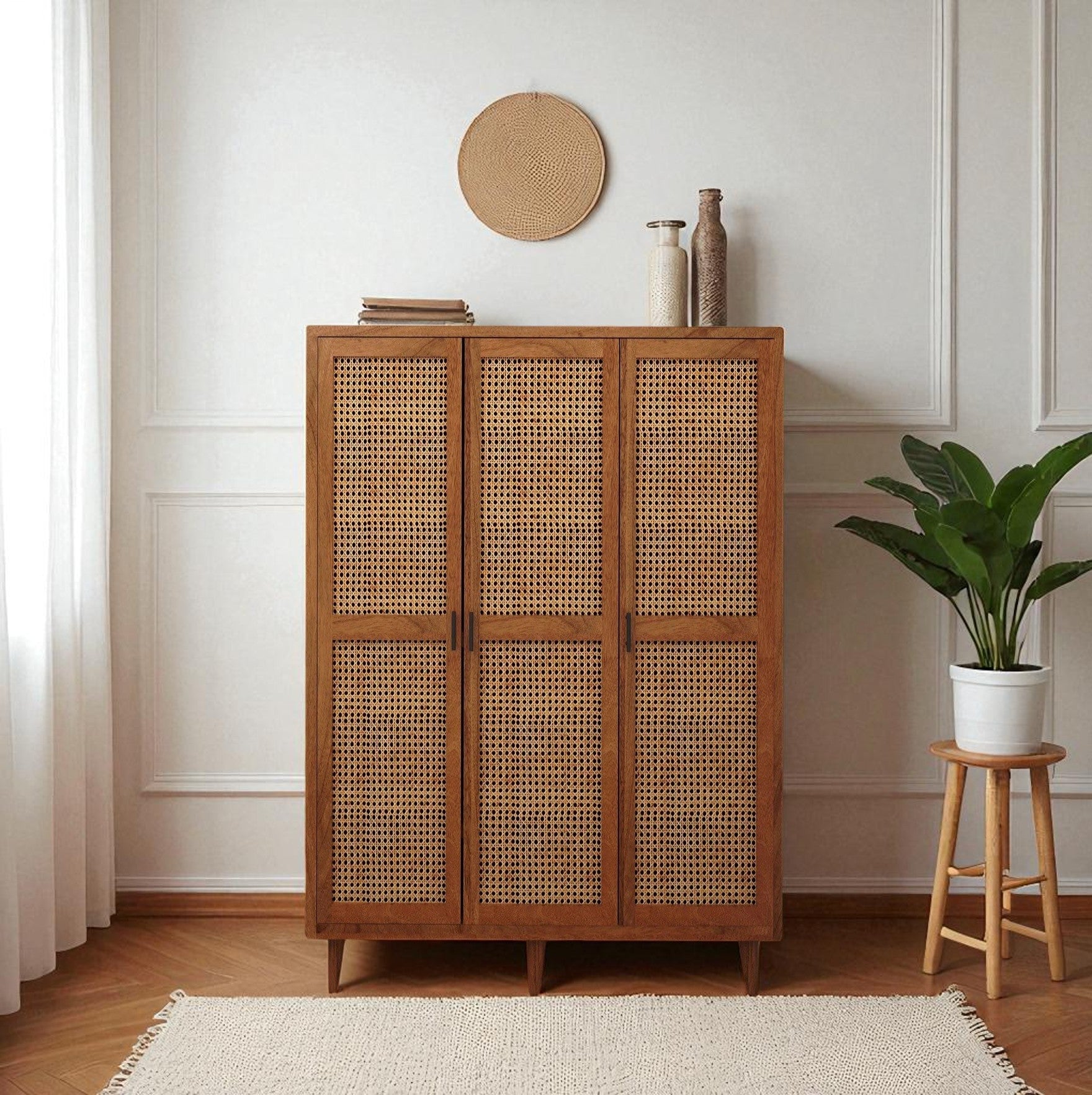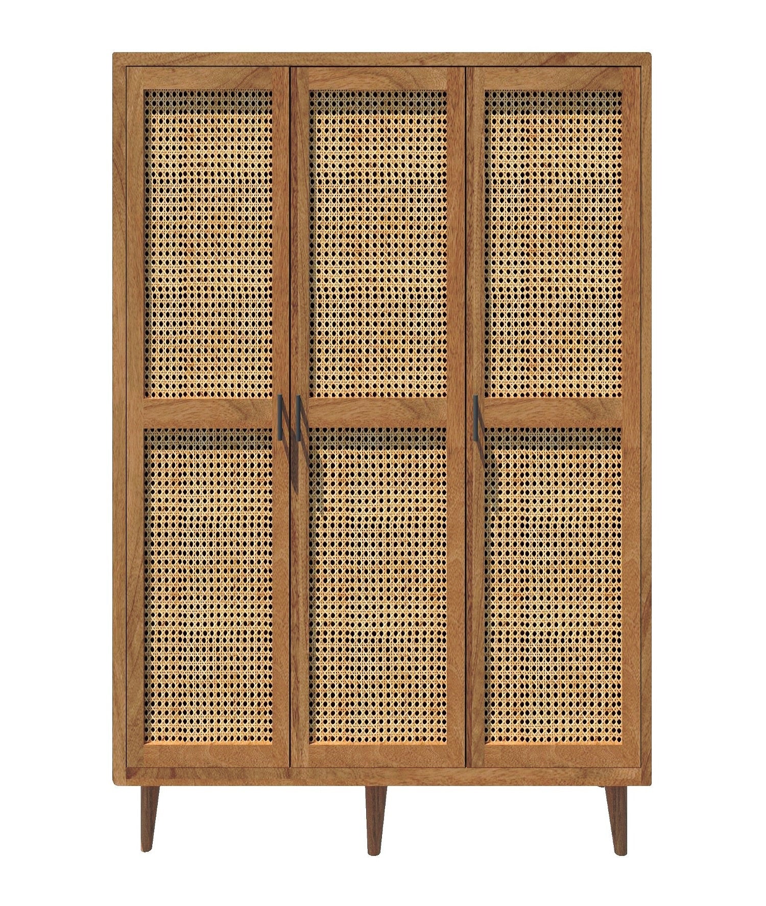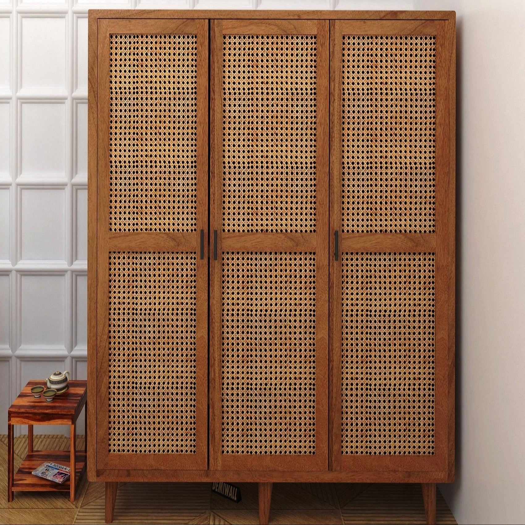 Solid Wood Rattan Cane 3 Door Wardrobe In Neutral Teak Finish